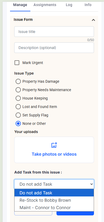 In specific cases, it may be helpful to allow trusted Staff to generate a Standard Task through the Issues Form on their Dashboard, thus skipping the administrative review step and immediately generating the Task for another Staff such as Maintenance.